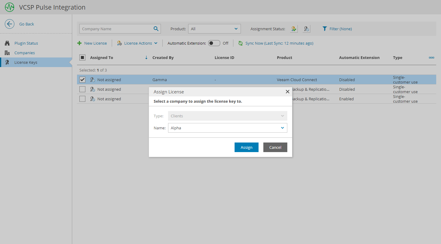 You can assign license keys to managed companies. When you assign a license key, VCSP Pulse creates a license for the company and returns created license ID.