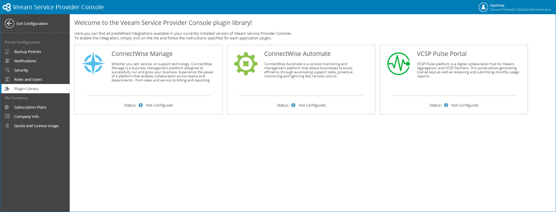 - At the top right corner of the Veeam Service Provider Console window, click Configuration.