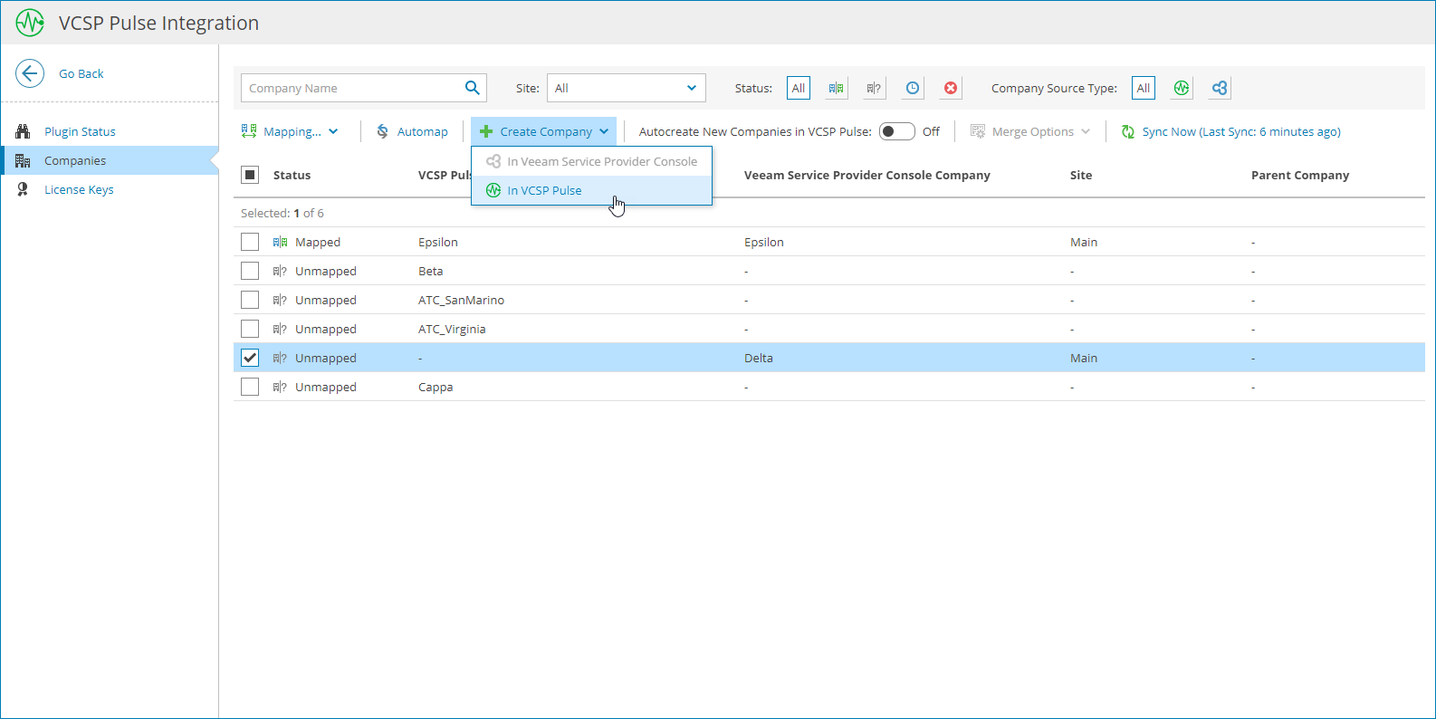 - From the list of companies, select unmapped Veeam Service Provider Console companies for which you want to create companies in VCSP Pulse.