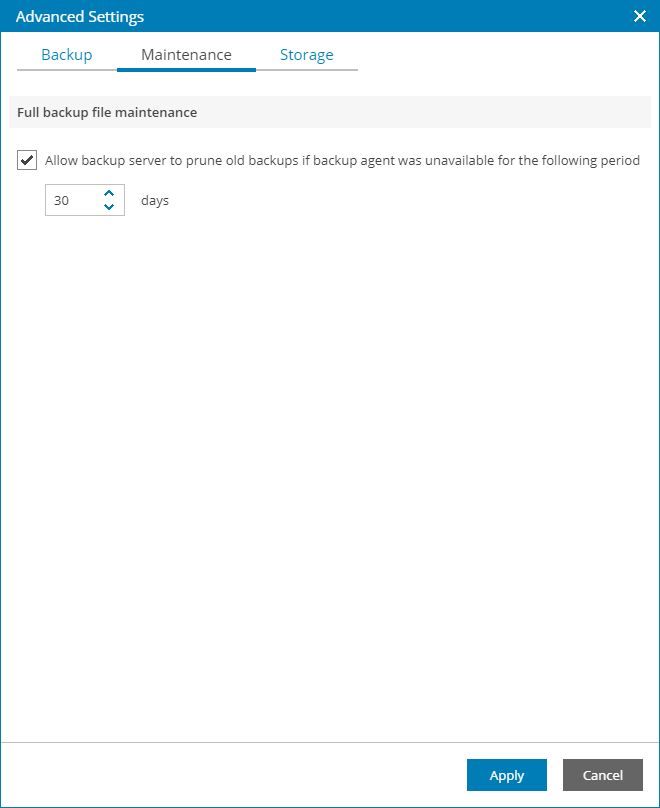 In the Full backup file maintenance section, specify the number of days for which you want to keep the backup created with the backup job in the target location. If Veeam Agent for Mac does not create new restore points for the backup, the backup will remain in the target location for the period that you have specified. When this period is over, the backup will be removed from the target location.