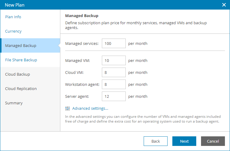 At the Managed Backup step of the wizard, specify charge rates for managed backup services: