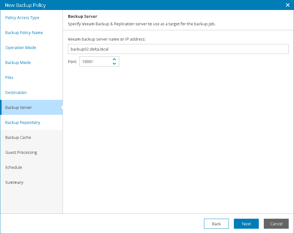 The Backup Server step of the wizard is available if at the Destination step you have chosen to store backup files on a Veeam Backup & Replication repository.