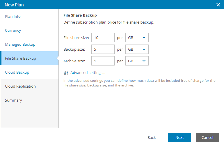- In the Backup size field, specify a charge rate for managing one GB or TB of file share backups.