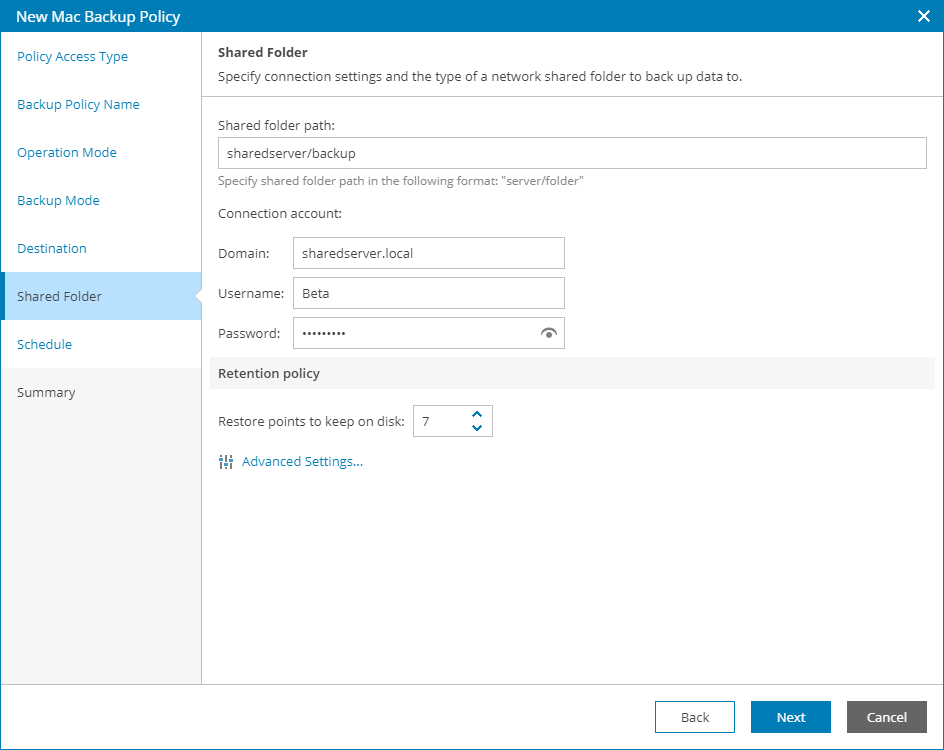 The Shared Folder step of the wizard is available if at the Destination step you have chosen to save the backup in a network shared folder.