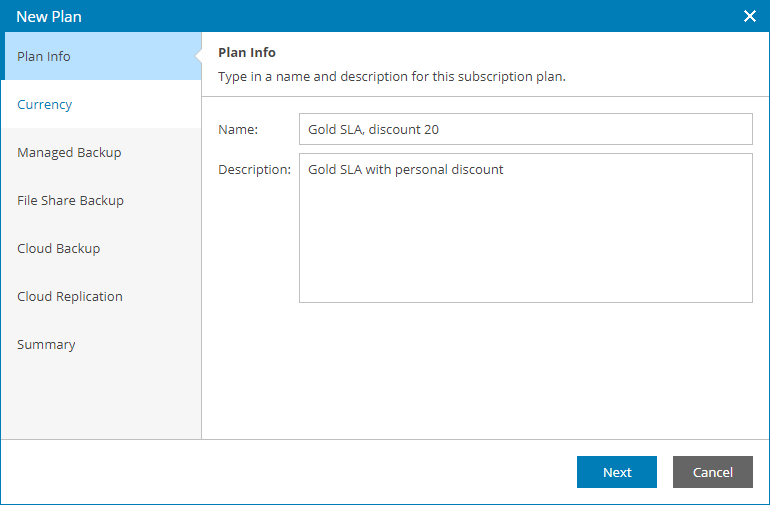 This is an archive version of the document. To get the most up-to-date information, see the current version. Step 2. Specify Subscription Plan Name and Description At the Plan Info step of the wizard, specify a name and description of a new subscription plan.