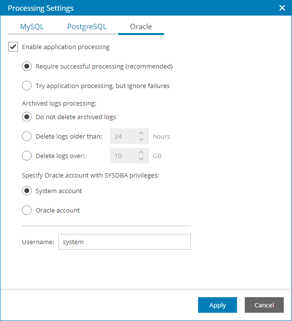 - Require successful processing. With this option selected, Veeam Agent for Linux will stop the backup process if an error occurs when processing the Oracle database system.