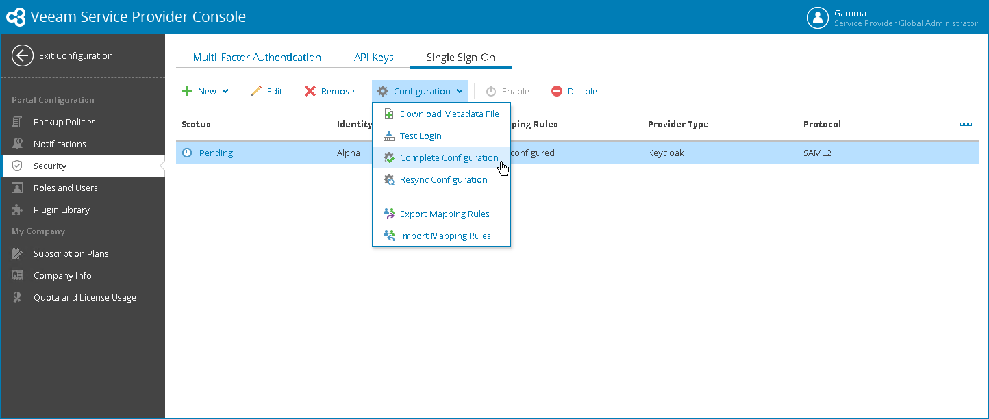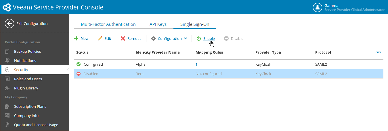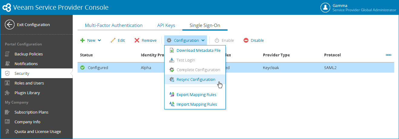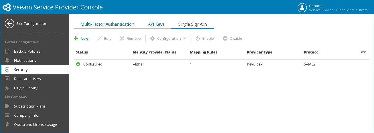 Veeam Service Provider Console allows you to create and manage IdP configurations to set up SSO authentication.