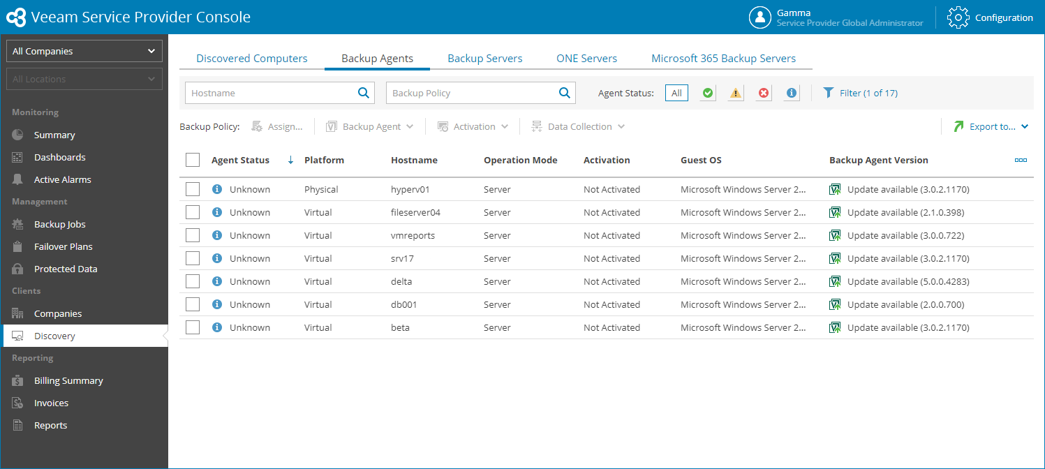 For example, you may need to perform the update procedure if computers in the client infrastructure already have Veeam backup agents installed, but the software version is not supported by Veeam Service Provider Console. To be able to manage Veeam backup agents in Veeam Service Provider Console, you must update the software to the supported version.