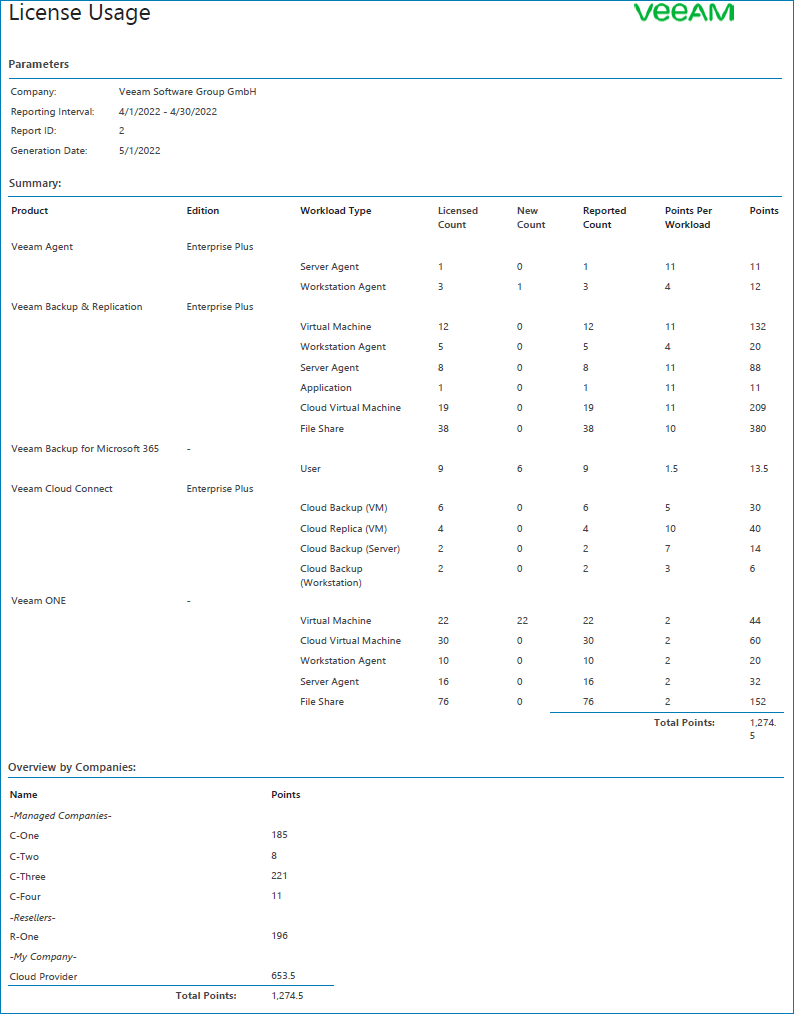 - [For Veeam Backup & Replication, Veeam ONE, Veeam Backup for Microsoft 365] the number of used points submitted in a license usage report on a client server.