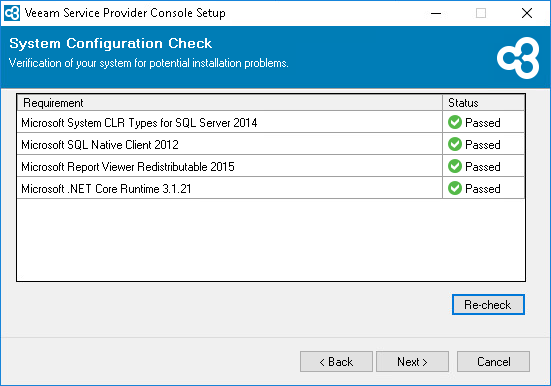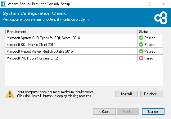 Before proceeding with the installation, the installer will perform system configuration check to determine if all prerequisite software is available on the machine. To learn what software is required for Veeam Service Provider Console, see System Requirements.