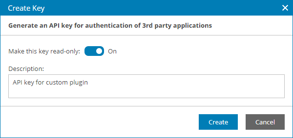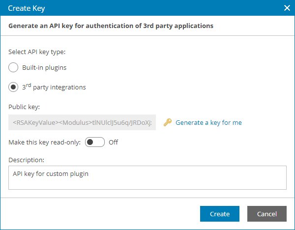 - Built-in plugins — choose this option to create an API key for Veeam Service Provider Console internal integrations. For details on Veeam Service Provider Console integrations, see Plugins and Integration.