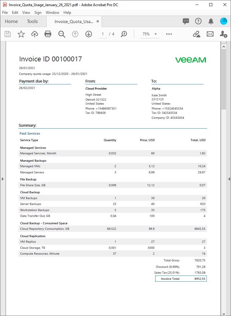 - Summary — charge rate information specified in the subscription plan, total gross cost, tax and discount, as well as the invoice total. This section also includes the cost breakdown for all types of provided services and the amount of services provided free of charge.