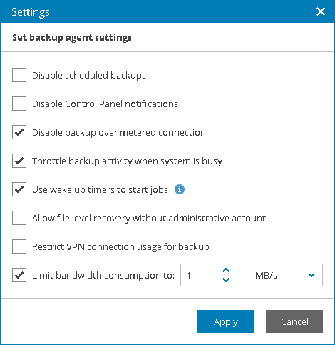 - Disable backup over metered connection — select this option if you want to disable backup over metered Internet connection to avoid extra costs. Veeam backup agents can automatically detect metered connections. If this option is enabled, Veeam backup agents will not perform backup when the endpoint is on such connection. For details, see section Disabling Backup over Metered Connections of the Veeam Agent for Microsoft Windows User Guide.