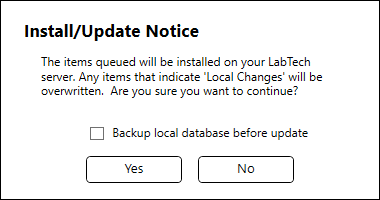 - In the Install/Update Notice window, choose whether you want to back up the ConnectWise Automate local database before update and click Yes. For details on ConnectWise Automate database backup, see ConnectWise Automate Documentation.