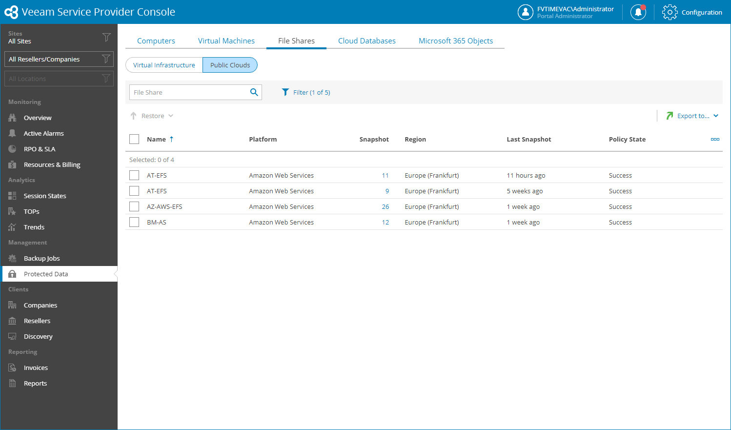 Veeam Service Provider Console will display a list of all file shares protected by Veeam Backup for Public Clouds.