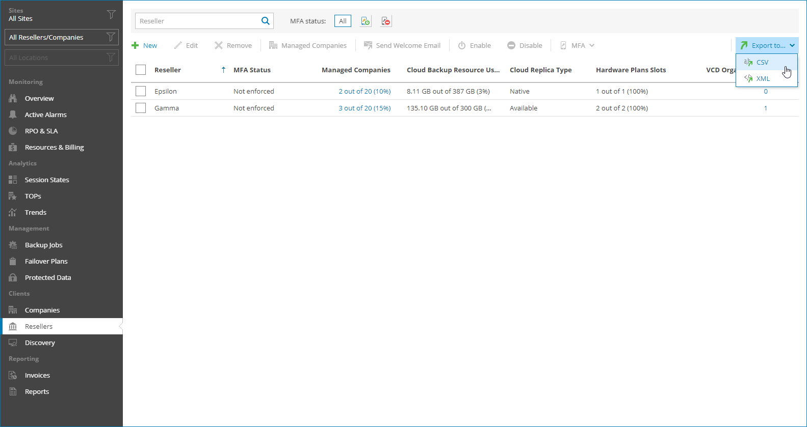 You can view reseller details and export them to a CSV or XML file.