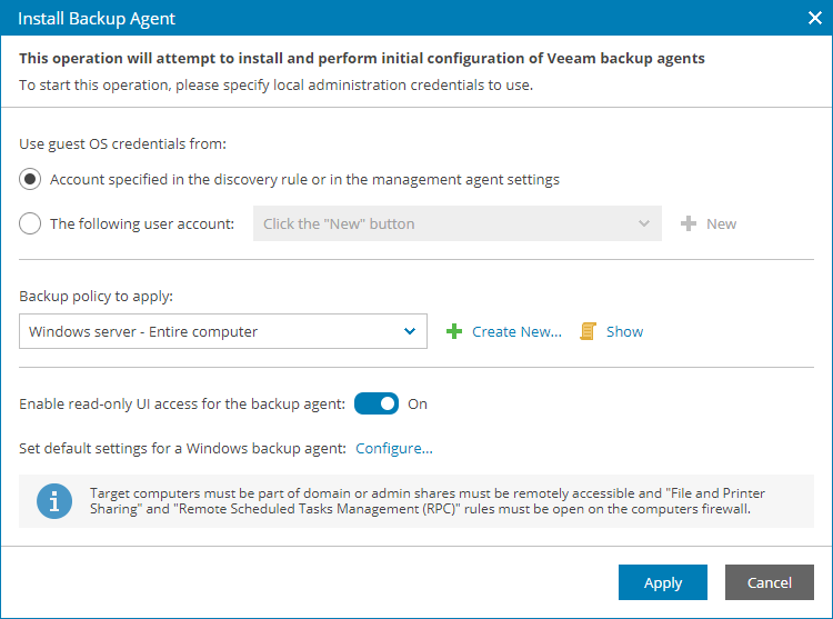 This account will be used to upload Veeam backup agent setup files to client or hosted computers and perform installation.