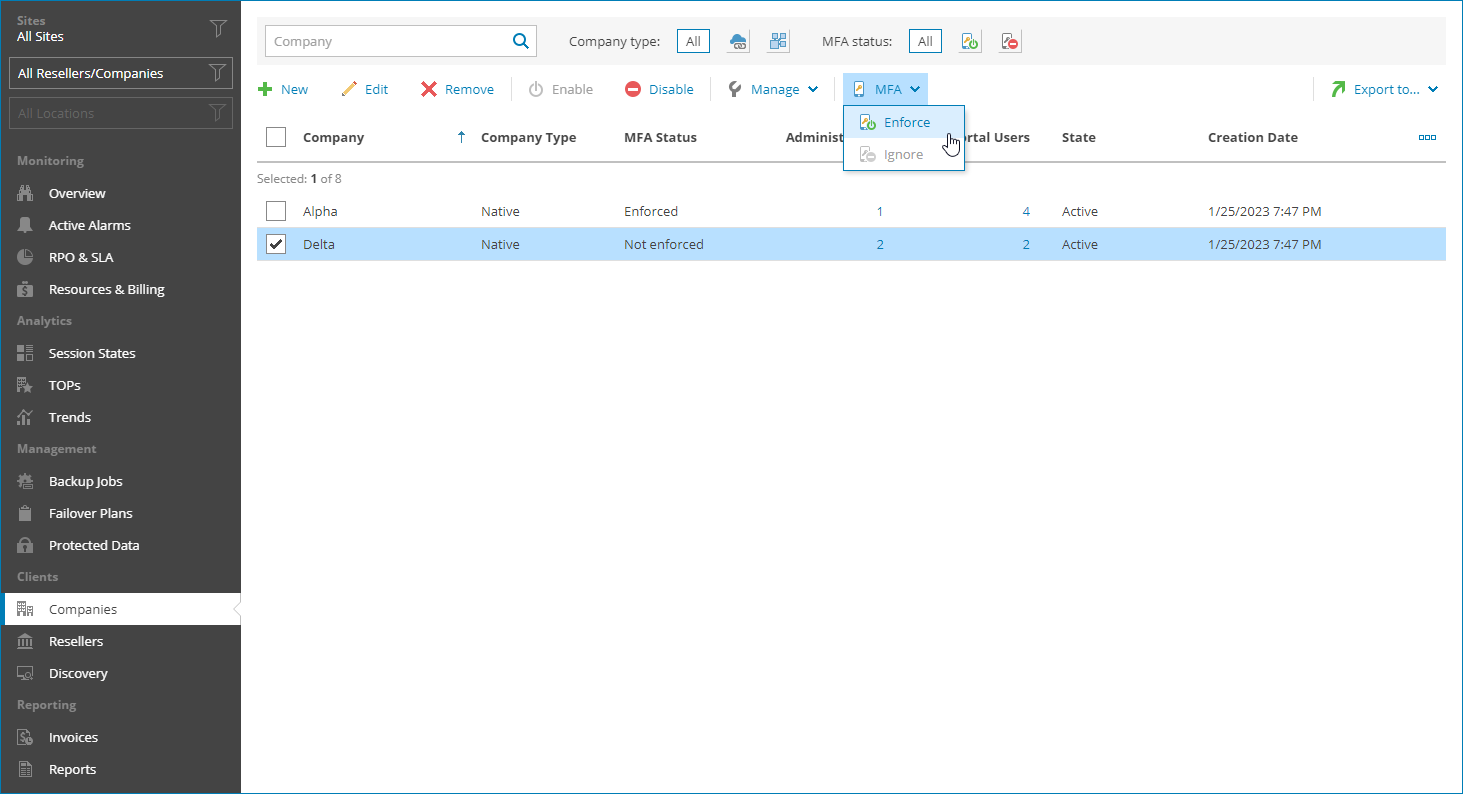 If the Enforce MFA for all managed clients and resellers policy is enabled or MFA is enabled for the reseller that manages the selected companies, you cannot disable MFA. For details, see MFA Policies. |