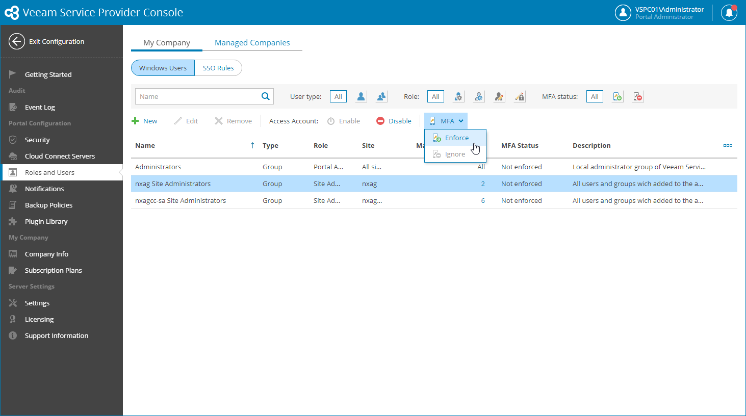 Alternatively, you can right-click the necessary user or user group, choose MFA and select Enforce.