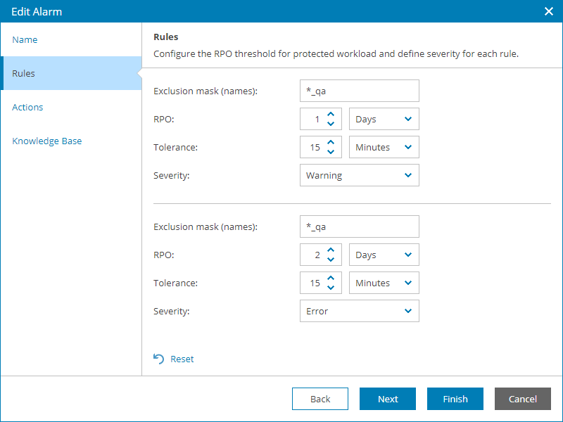 At the Rules step of the wizard, specify conditions according to which the alarm must be triggered. Options available for alarm rules vary for different alarms. Depending on the alarm type, you may need to modify alarm thresholds, alarm tolerance, alarm severity and so on.