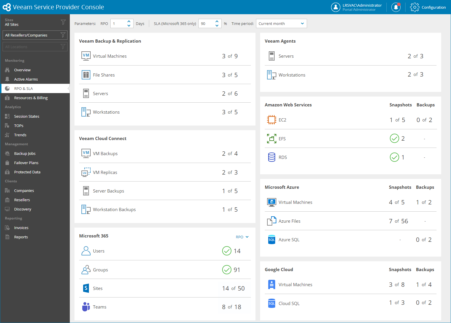 By default, the dashboard represents data summary for last 30 days and for workloads with RPO of 1 day or SLA of 90% (for Microsoft 365 workloads). You can change time period to Previous month or Current month options by selecting it from the Time period drop-down list. To change RPO and SLA settings, specify the necessary values in the Parameters section.