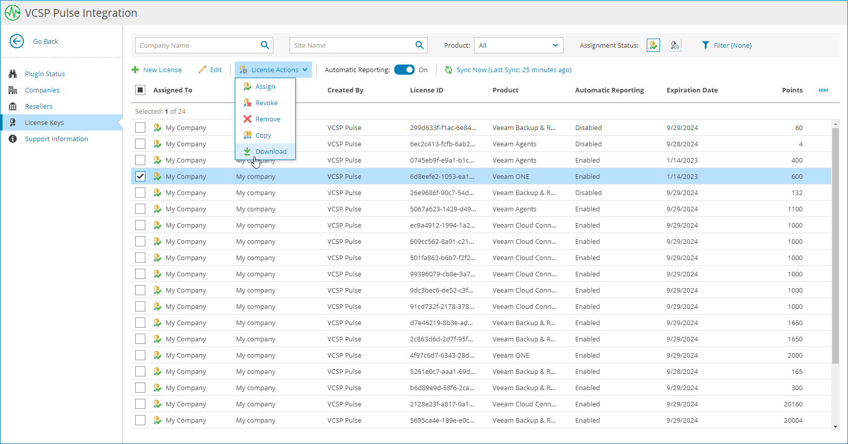 Veeam Service Provider Console will display a list of all license keys managed in VCSP Pulse.