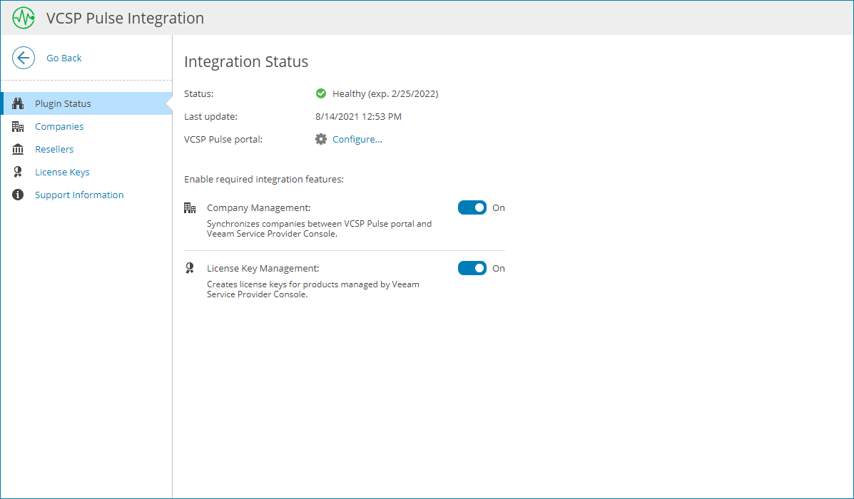 Select information you want to share between Veeam Service Provider Console and VCSP Pulse, and enable the necessary features:
