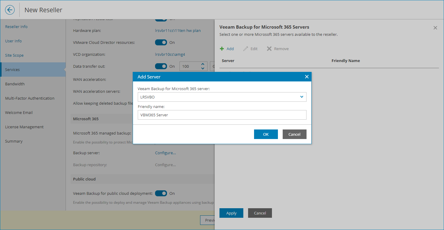 You can add more than one Veeam Backup for Microsoft 365 server for the reseller. Repeat steps 1–3 for all servers you want to allocate.
