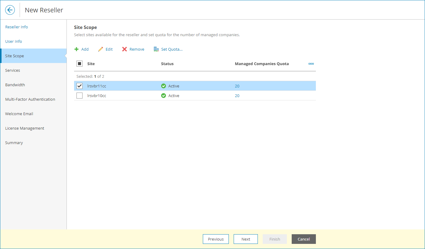 At the Site Scope step of the wizard, specify Veeam Cloud Connect sites whose backup and replication resources will be available to a reseller: