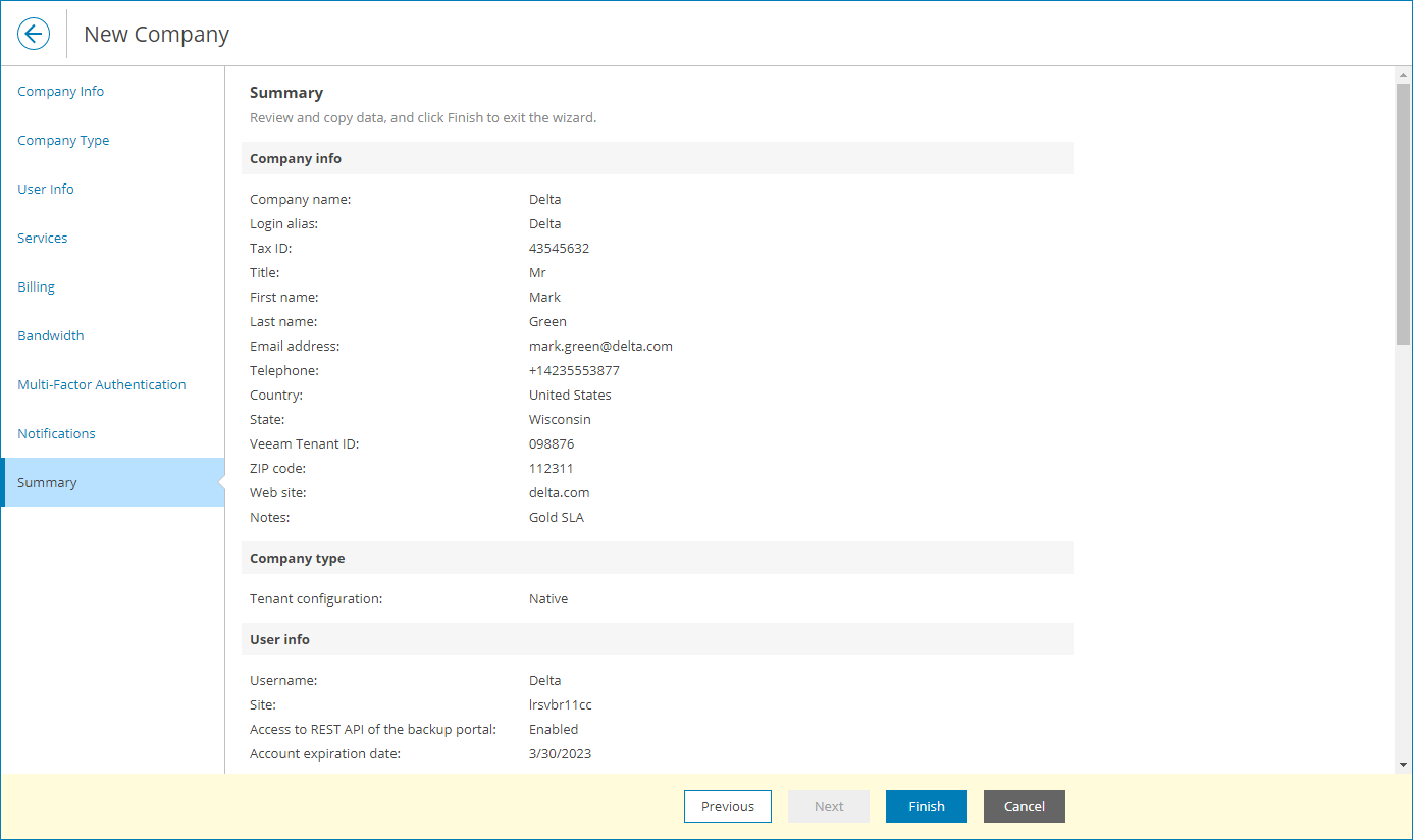 1. To send a welcome email message to the company, select the Send welcome email notification to the client when I click Finish check box.