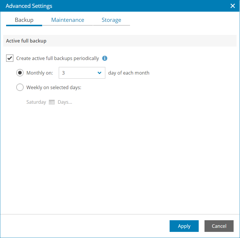 If you want to periodically create active full backups, on the Backup tab of the Advanced Settings window, select the Create active full backups periodically check box. Use the Monthly on or Weekly on selected days options to define scheduling settings.