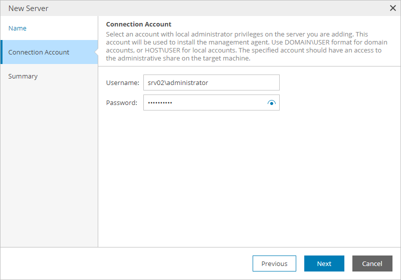 - At the Connection Account step of the wizard, specify credentials of a user account with local Administrator privileges on the Veeam Backup for Microsoft 365 server.