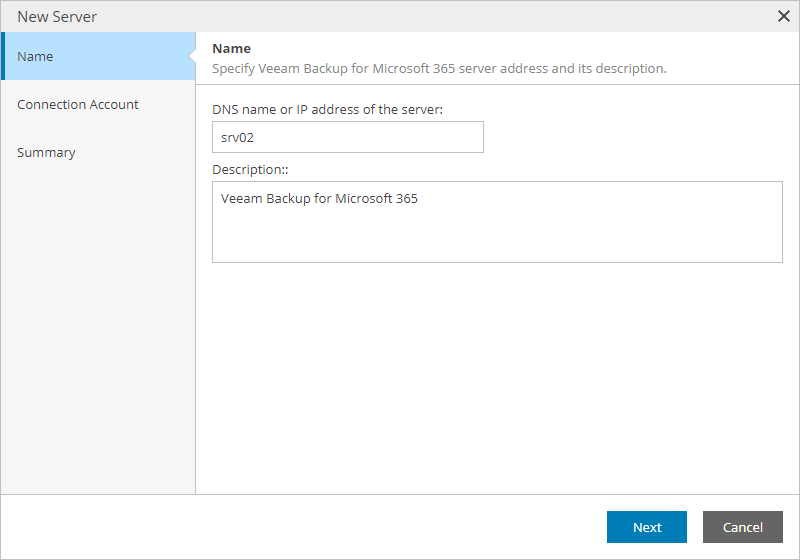 - In the DNS name or IP address of the server field, type FQDN or IP address of the Veeam Backup for Microsoft 365 server.