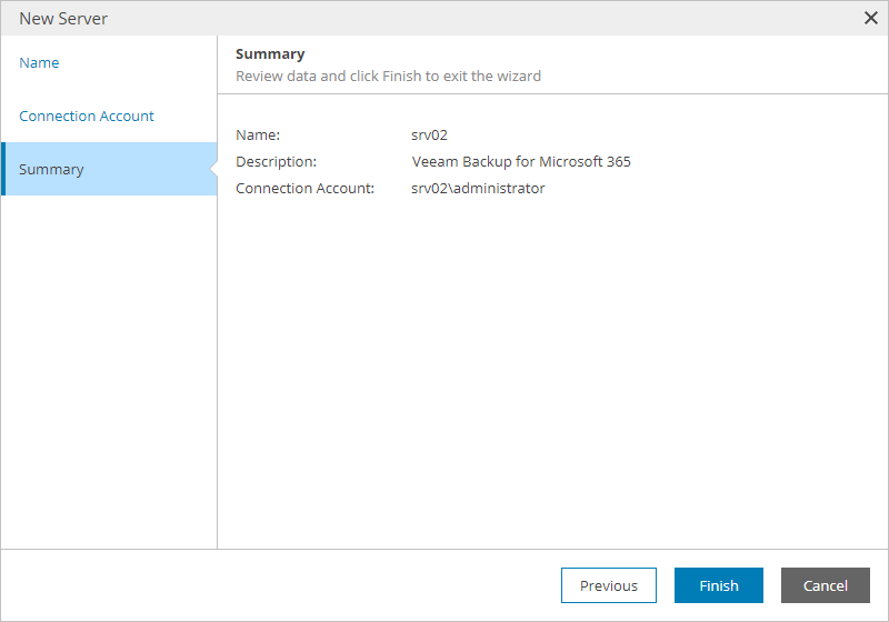 - At the Summary step of the wizard, review connection settings and click Finish.