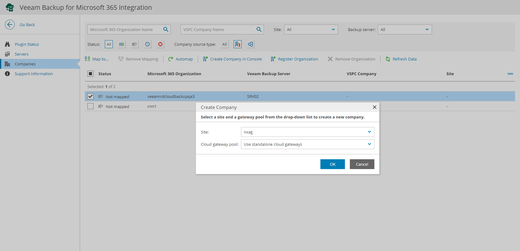 - From the list of companies and organizations, select unmapped Veeam Backup for Microsoft 365 organizations for which you want to create companies in Veeam Service Provider Console.