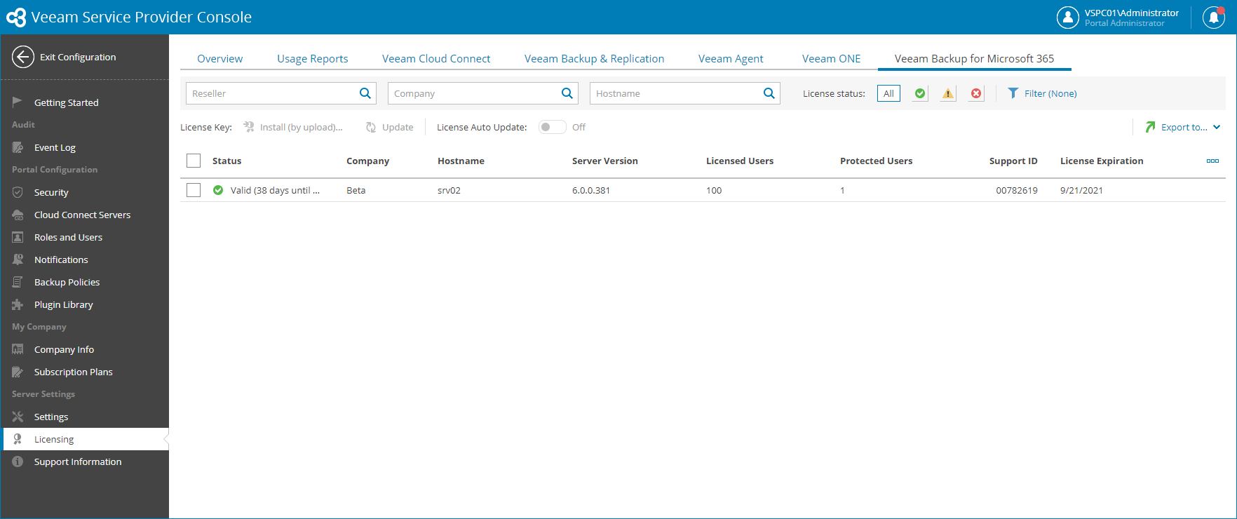 The Veeam Backup for Microsoft 365 view provides a list of Veeam Backup for Microsoft 365 servers managed in Veeam Service Provider Console, and information about their license status.