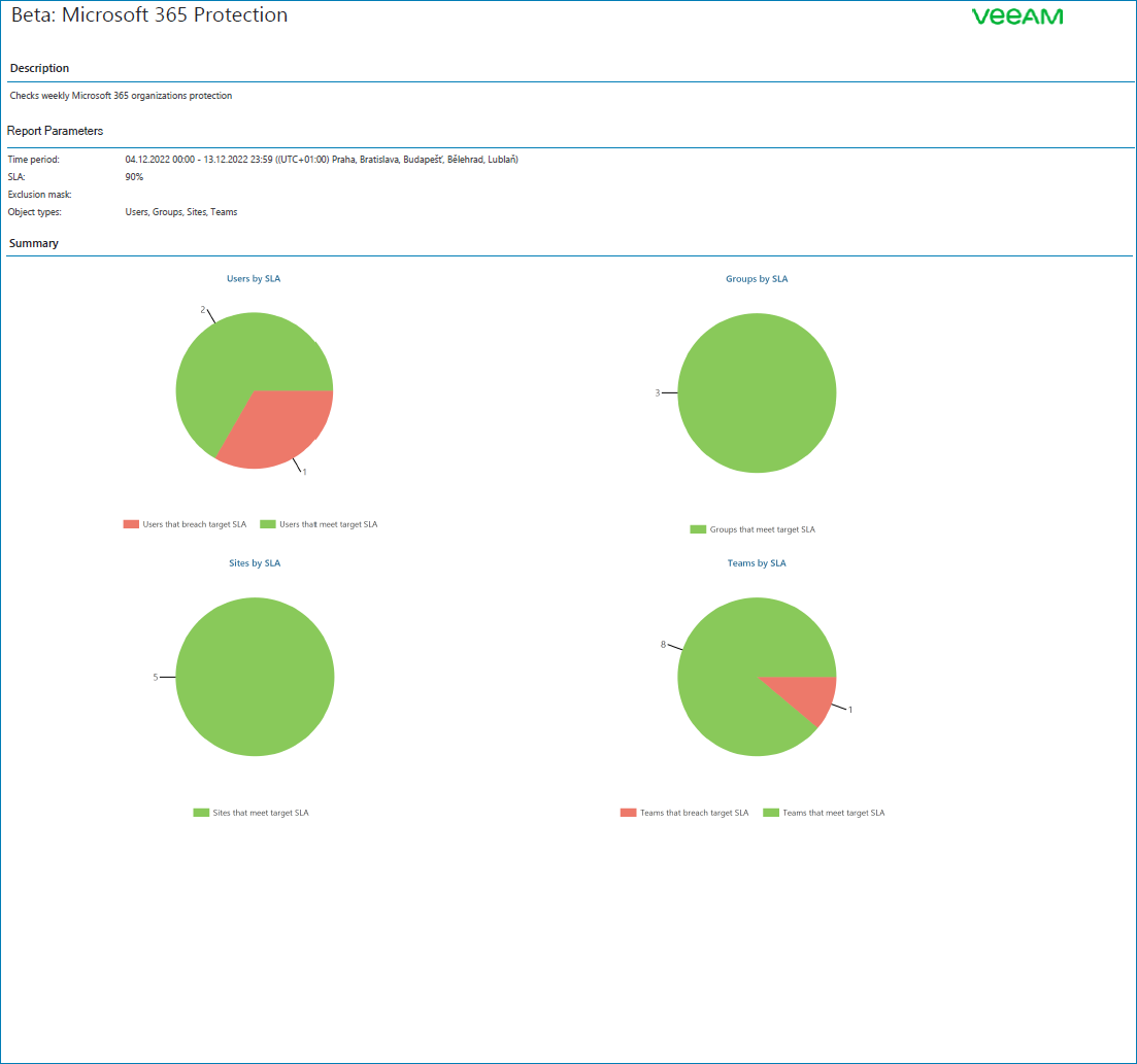 • The Details section provides information about all objects that meet and breach the target SLA including object name, number of available restore points, number of successful job sessions, SLA percentage and configured job schedule. For summary report, this section also provides information about Veeam Backup for Microsoft 365 server name and backup job name and destination.