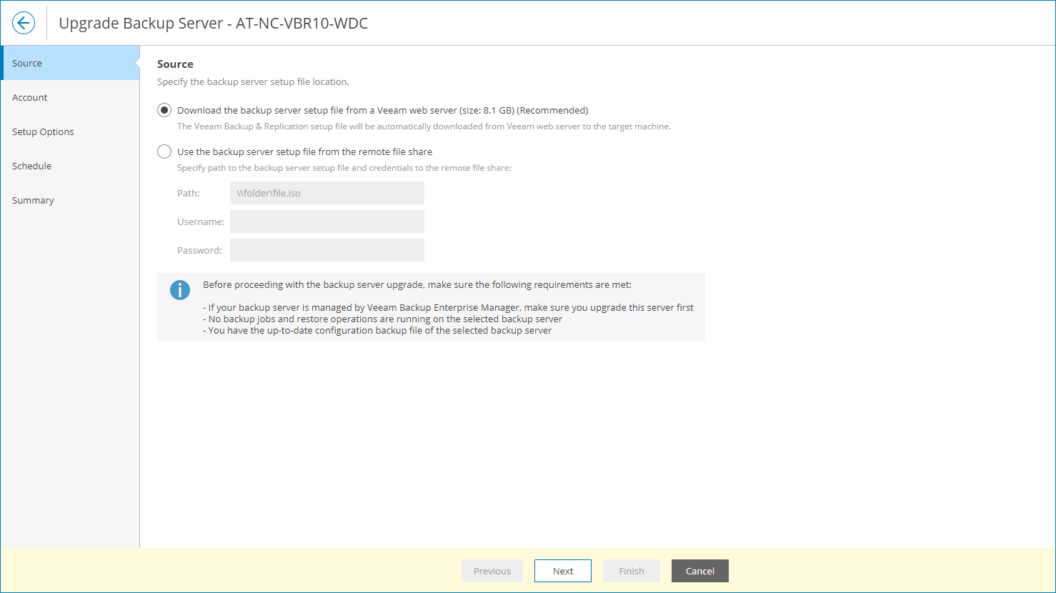 - To use a latest distribution from Veeam License Update server, select the Download the backup server setup file from a Veeam web server option.