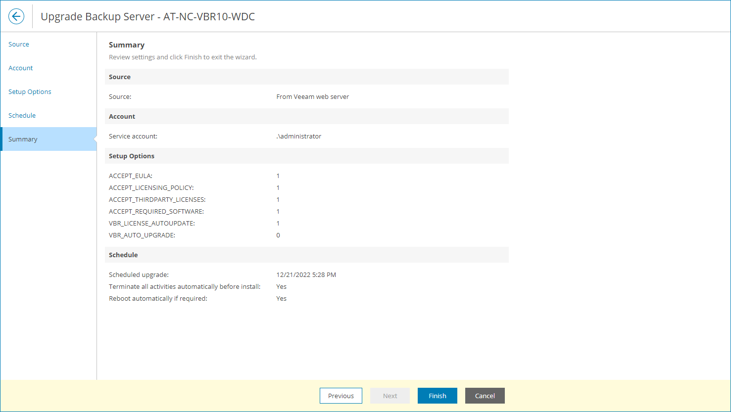 - At the Summary step of the wizard, review upgrade settings and click Finish.