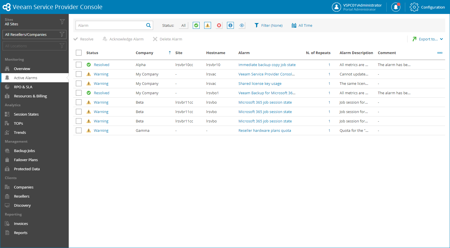 Veeam Service Provider Console will display a list of all triggered alarms.