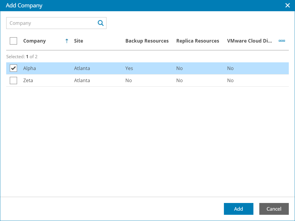 - From the list of companies, select the company that you created for the previous scenarios and click Add.
