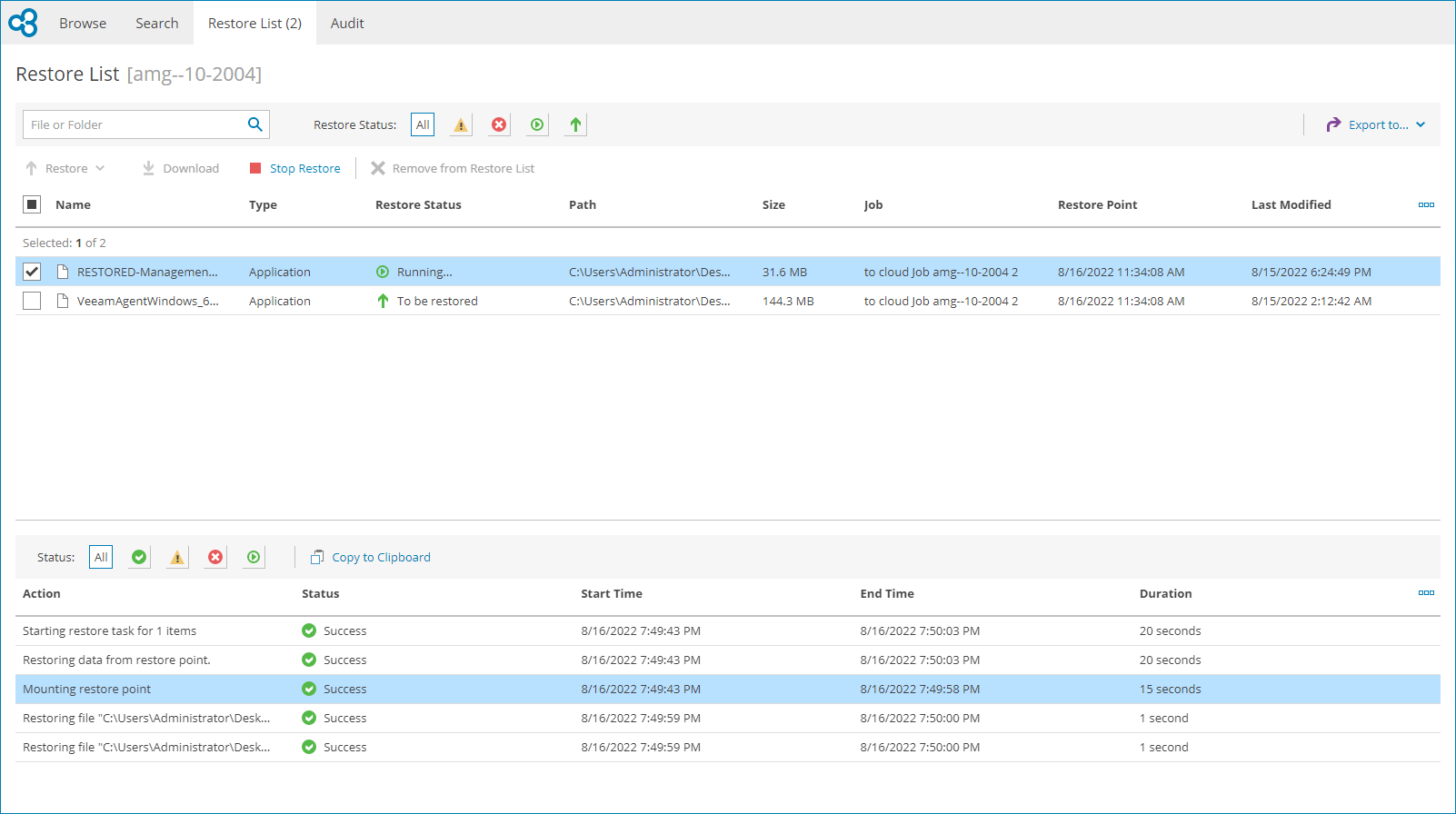 Veeam Service Provider Console will start the selected restore session. After you start the restore, you can view restore session details in the Session Log section.