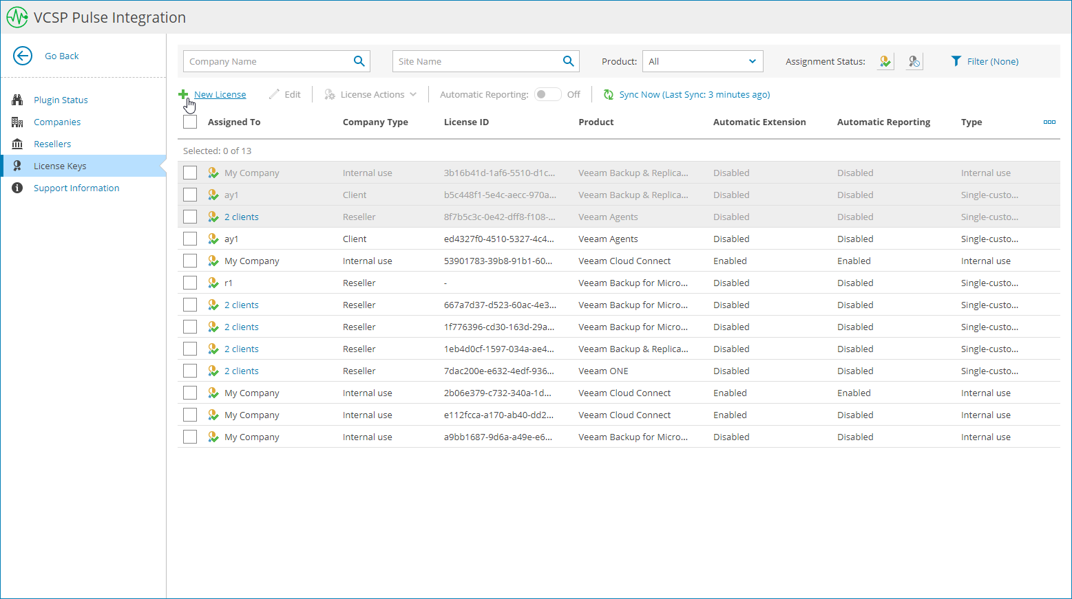 You can create license keys, manage created and retrieved from VCSP Pulse license keys, and assign license keys internally or to managed resellers and companies. When you create a license key, plugin creates a license template for VCSP Pulse.