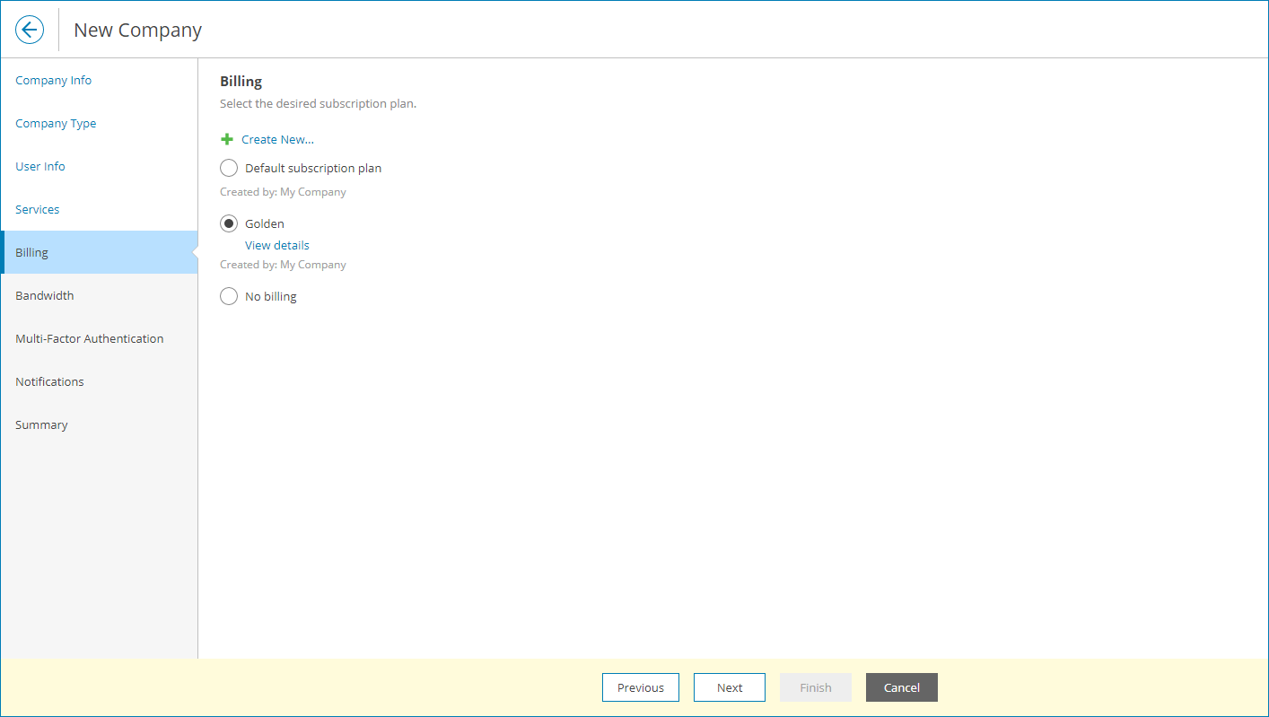 - At the Billing step of the wizard, select the subscription plan that you created at the Configure Subscription Plan step.
