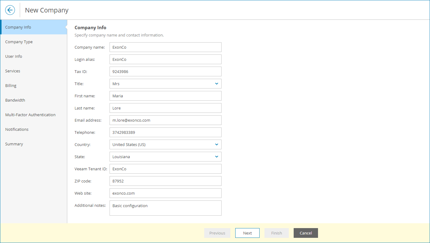 The email address you specify at this step will be used for communication with users within the company. To this address, Veeam Service Provider Console will send email notifications intended for the company. For trial purposes, you can specify in this field an email address that belongs to you, so that you can check notifications sent from Veeam Service Provider Console.