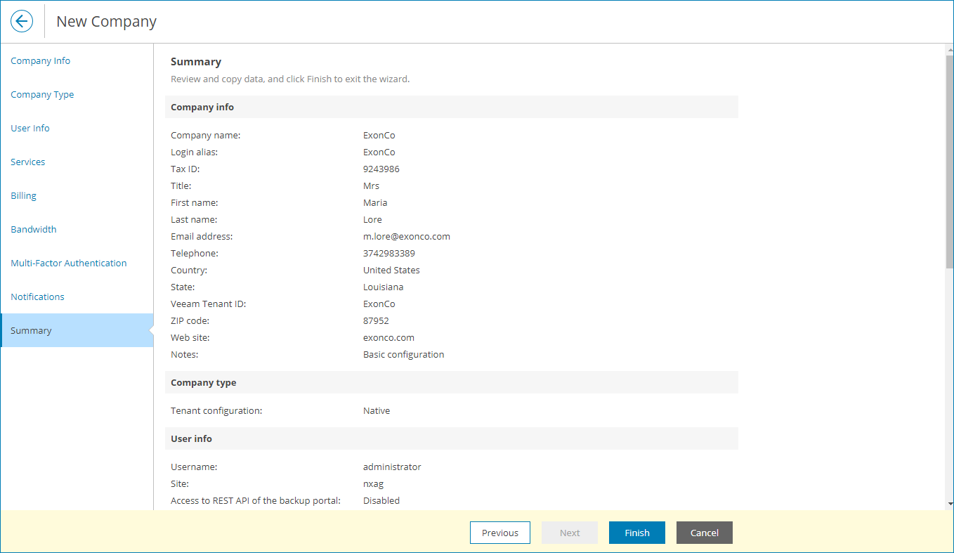 - After you click Finish, Veeam Service Provider Console will send a welcome email notification at the email address that you specified at the Company Info step.