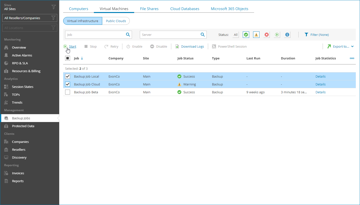 1. Select a backup, replication or backup copy job in the list and click Start.