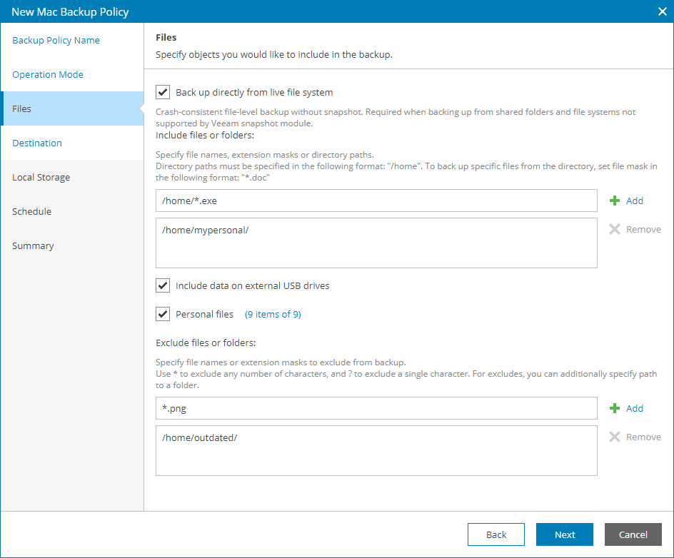 You can specify file names and/or masks for file types that you do not want to back up, for example, OldPhotos.rar, *.tmp, *.back. Veeam backup agent will back up all files except files of the specified type.