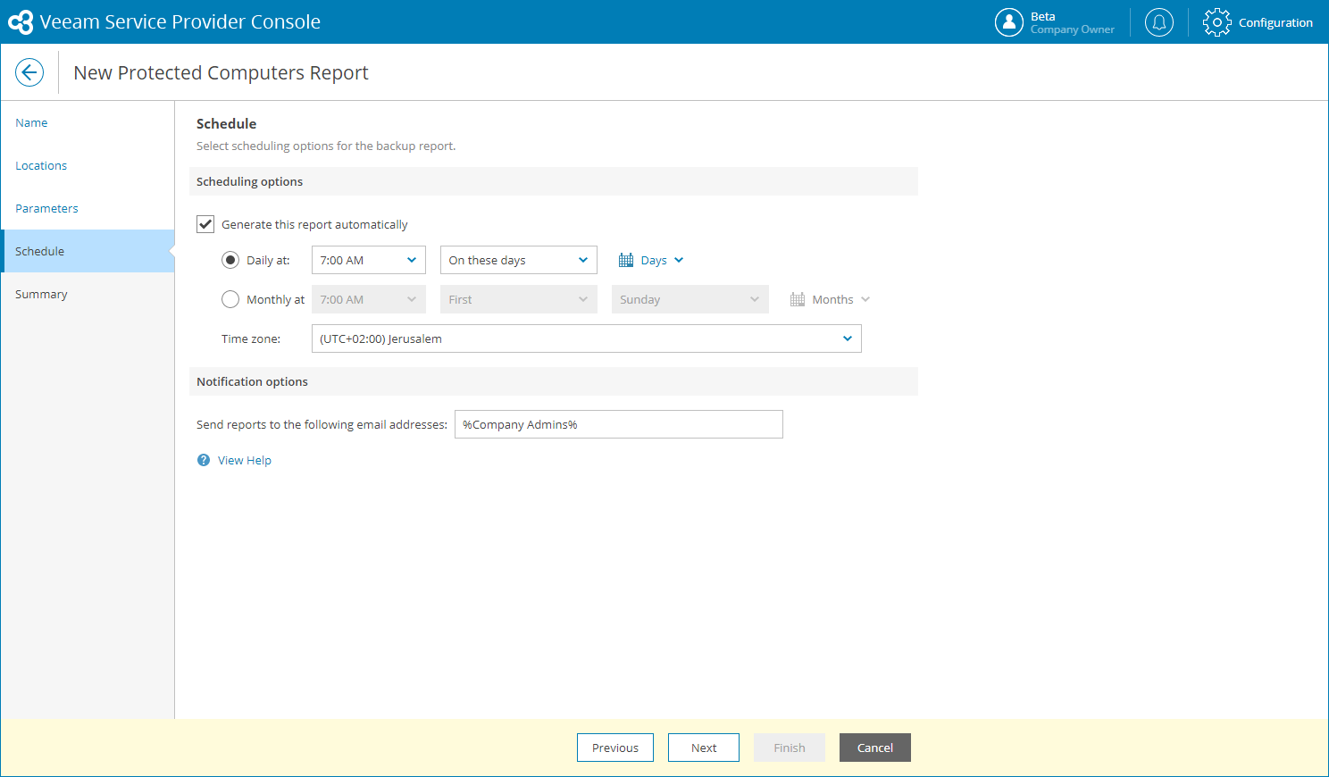 - At the Schedule step of the wizard, specify a schedule according to which the report must be generated: