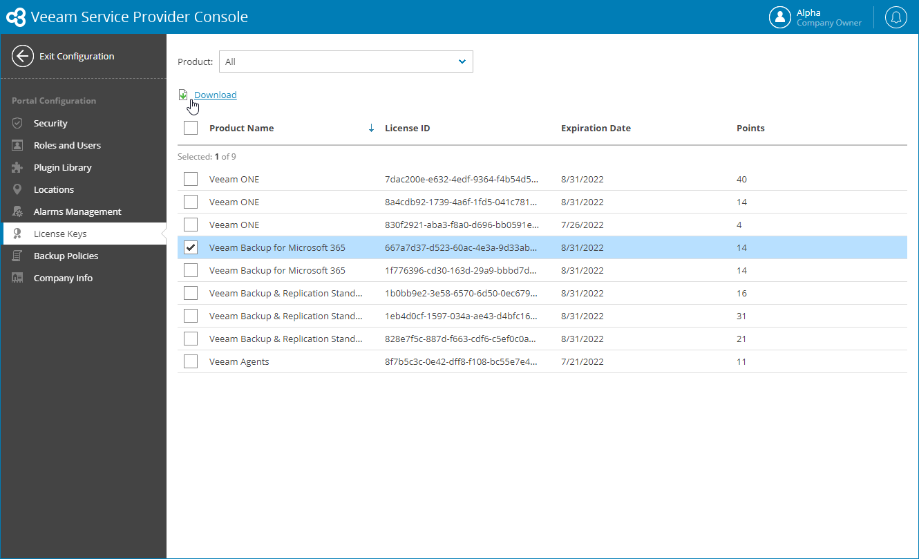 Veeam Service Provider Console will display all license keys assigned to your company.
